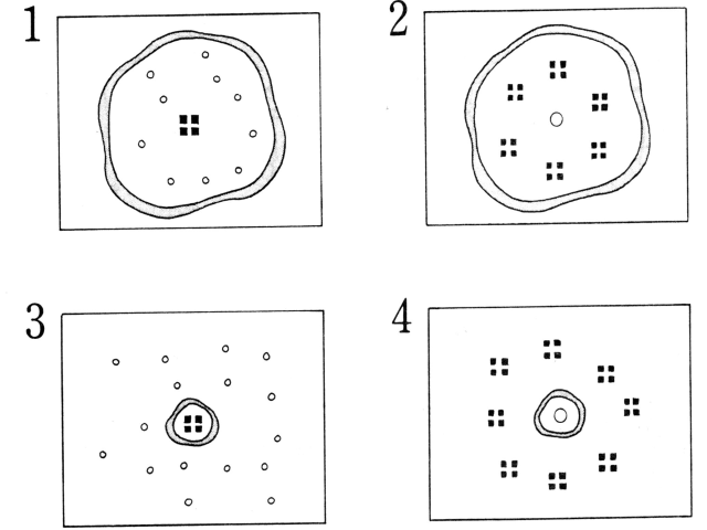 聴解スクリプト: 8番 古代の村の遺跡が発見されました。 考古学者がそれについて写真を見せながら説明しています。 その写真はどれですか。 男:先日、この町で発見された古代の村の遺跡ですが。 調査の結果、次のような構造をなしてることが分かりました。 えー、この写真を見てください。 これは上から見たとこらなんですが、村の中心部にやぐら、つまり周囲を見渡すための高い建物があったようです。 この四本の柱の跡がそれを表しています。 そして、そのやぐらを取り囲むようにして家がありました。 丸い穴がそれぞれの家のかまどの跡です。 家ごとにかまどで煮炊きをして、食事を作っていたんですね。 それから、村の周囲にはこのように堀が掘られていて、そこに水を張って、敵の侵入を防ごうとしたことが分かります。 発見された遺跡の写真はどれですか。