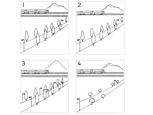 聴解スクリプト: 10番 問題:今の町の姿はどれですか。 女:思ったよりあんまり変わっていませんねえ、この町は。 男:ええ。 でも、あの山は何とかならないんですかねえ。 相変わらず切り崩したまんまで。 でも、鉄道はあの頃は単線だったのに複線になったんですねえ。 女:昔はよく駅ですれ違う汽車が通りすぎるのを待っていたものでしたけどねえ。 しかし、ずいぶんこの並木立派になりましたねえ。 男:ええ。 以前はもっとまばらで、ある頃はまだ苗木が植えられたばかりだったから。 女:でも、やっぱり増えてませんね。 この道の電気。 男:ええ。 あの頃、夜なんかこの道を通ると暗くて恐かったですよね。 質問:今の町の姿はどれですか。