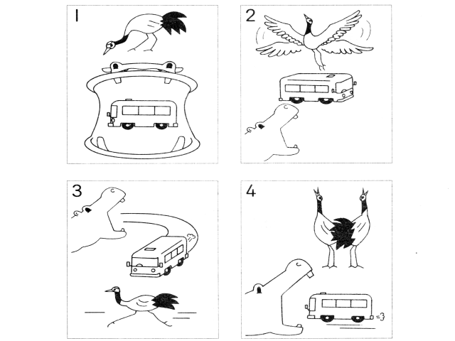 聴解スクリプト: 11番 問題:二人で決めたポスターはどれですか? 女:この傑作、口の中にバスが入っちゃってる。 見た人の目をひくんじゃないかなあ。 男:いいね、だけど、ちょっとあんまり大胆で、なんだかよくわからなくないかなあ。 後ろ口に入る直前のこれのほうが全体の構成としては分かりやすいんじゃないんかなあ。 女:確かに分かりやすいのがいいよね。 動きを感じるって点じゃ、このた、た、たっと鳥が駆けてるのもいいけどね。 男:木の羽をばたばたさせているのも、舞い上がるみたいで面白いね。 女:でも、やはり分かりやすいのにしよう。 質問:二人で決めたポスターはどれですか?