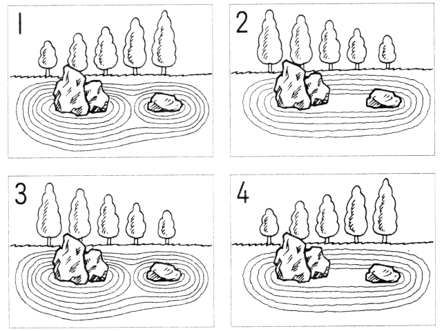 聴解スクリプト: 12番 問題:ある庭の説明です。 どの庭について話していますか。 男:この庭で最初に目に入るのは、二つ並んだ岩です。 やや離れた所にもうひとつ。 それらはお互いに影響しなたら、調和を保っています。 その事を波の形をした砂が表現しています。 岩の回りの別々の波が、やがて一つにまとまっていくのです。 また、三つの岩のてっぺんの所を線でつないでみると、背後の木木と平行になっているのがわかると思います。 目に入る全てのもので、調和を表現しているのです。 質問:どの庭について話していますか。