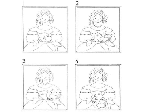 聴解スクリプト: 14番 問題:女の人は肖像画について説明しています。 絵のもとの姿はどれですか? 女:次は、この肖像画をご覧ください、この絵は16世紀の傑作と言われていますが、最近の調査で、実は後世に何者かによって、一部書き直されてることが分かりました。 それはこの右手の部分なんですが、現在私たちが見ているこの絵では、リンゴ持っていますね。 ところがエック線を使って詳しく調べたところ。 このリンゴの絵の下に子鳥の絵が書かれていたことに分かりました。 そこで、リンゴ絵の絵の具と他の部分の絵の具を調べたところ、やはり異なる時代の物を判明しました。 絵の具と言えば、実は、首にかけているネックレスも新しい絵の具で書かれているのですが、これについては、絵の痛みが激しい部分を18世紀に元通り修復したものだという記録が残っています。 質問:絵のもとの姿はどれですか?