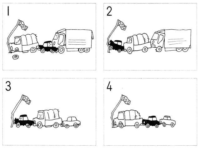 聴解スクリプト: 3番 問題:交通事故について話しています。 二人が話している事故はどれですか。 女:ほら、見てあそこ。 男:うわあ、ひいでえ事故だな。 めっちゃくっちゃ。 女:きっと、先頭の車、角を曲がりきれずに信号機にぶつかっちゃったのね。 男:で、後ろを走っていた車が急ブレーキをかけたけど間に合わないで…。 女:そう。 さらに悪いことに後ろからも衝突されて。 男:前後からでかいのに押しつぶされちゃった形だね。 女:私たちも気をつけないと。 質問:二人が話している事故はどれですか。