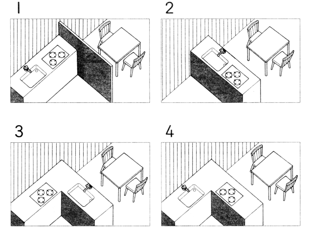聴解スクリプト: 7番 問題:夫と妻がいろいろな台所の写真を見ながら話しています。 妻はどれがいいと言っていますか。 女:ねえ、新しく家を建てる時はこんな台所にしたいわねえ。 男:うん、家の台所は使いにくいからね。 女:流しとガス台を壁側に一列に並べるのはよくあるけど、こんなふうに台所仕事しながらテーブルの人と話ができるのは解放的でいいわねえ。 男:なるほど、流しで皿洗いをしながら話ができるんだ。 でも、むしろガス台をテーブルの方に向けたらどうかな。 女:それはだめよ。 だって油が飛び散って汚れるじゃない。 男:そうか。 質問:妻はどの台所がいいと言っていますか。