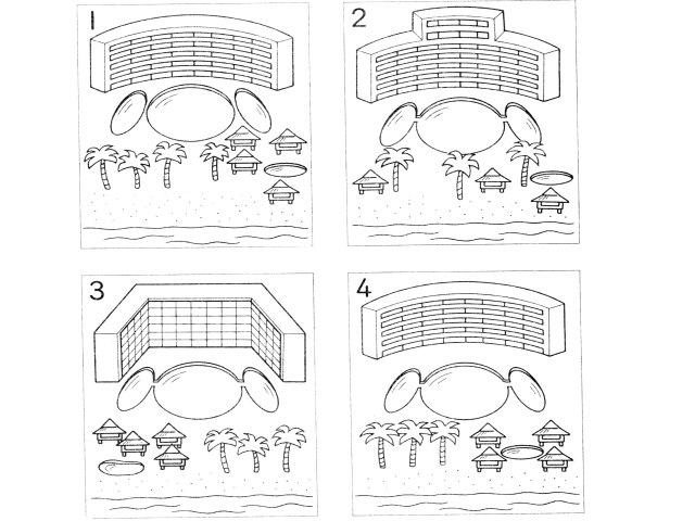 聴解スクリプト: 8番 問題:女の人が、新しくできたりゾートホテルについて説明しています。 このホテルはどれですか。 女:私どものホテルは、全体が周囲の自然にやさしく溶け込むように、軟らかな曲線のイメージを大切にして設計されています。 ホテルの建物はプールの眺めは滞在の忘れられない思い出の一つになるでしょう。 中庭の大小様々な形のプールは全てつながっていて、また海辺の一角の集められた別荘のようなコテージ村の中には別のもう一つのプールがあります。 質問:このホテルはどれですか。