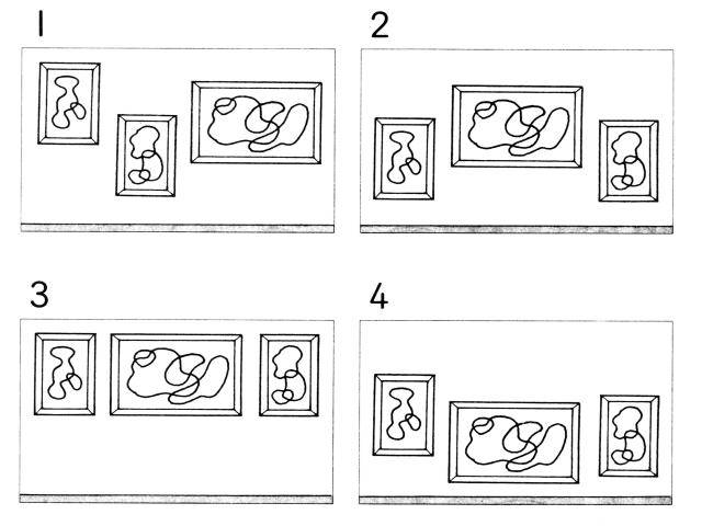 聴解スクリプト: 9番 問題:男の人と女の人が壁にどうやって絵をかけるか話し合っています。 二人はどういう配置で絵をかけることにしましたか。 男:さっ、荷物を片付けないと。 女:あとはこの絵だけね。 男:うん、ちょっと並べてくれないか。 女:大きいのを真ん中にして、こんなのでどう? 男:うーん、落ち着いているのはいいけど動きがなくて単調だなあ。 せっかくの広い壁なんだから、もっとさあ。 女:じゃあ、こんなふうに高さを変えてみる? 男:それじゃあ、下がり過ぎだろう。 女:じゃあ、真ん中のを上げて、こんな感じは? 男:うん、なかなかいいね。 女:ねえ、この縦長の二枚を左側の方に持ってきて。 男:いや、それはちょっとね。 まとまりに欠けるな。 さっきので行こうよ。 女:うん。 質問:二人はどういう配置で絵をかけることにしましたか。