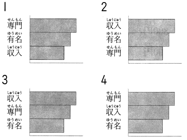 聴解スクリプト: 十五番 女の人がスポーツニュースでマラソンの結果について話しています。大川選手は第何位でしたか。 午前九時、選手が一斉に競技場をスタート。期待の大川選手、先頭集団のいい位置につきます。約二十人ほどの集団のまま、ほぼ同時に折り返し点を通過。その直後、チャンスを見計らって、大川選手集団から飛び出します。しかしその後分後、背後から迫る山田選手に追いつかれてしまいます。激しいトップ争いになりましたが、大川、山田のスピードについていけません。ゴール直前更に一人に追い抜かれてしまいました。 大川選手は第何位でしたか。 1、 第一位でした。 2、 第二位でした。 3、 第三位でした。 4、 第四位でした。