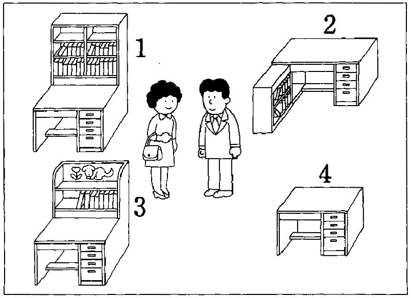 聴解スクリプト: 2番 女の人は子供の机を買いに行きました。どの机を買うことにしましたか。 男:いらっしゃいませ! 女:あの、子供の机なんですけれどね。 男:はい。こちらにいろいろございますが。 女:そうね。絵なんかがついてる、子供っぽいのじゃなくて。あ、それから窓のところにおくんで、あまり背が高すぎるのもね。 男:然様でございますか。そうしますと、これなんかいかがでしょうか。 女:でもそれだと本棚を別に買わなきゃいけないから。こっち何するわ。 女の人はどの机を買うことにしましたか。