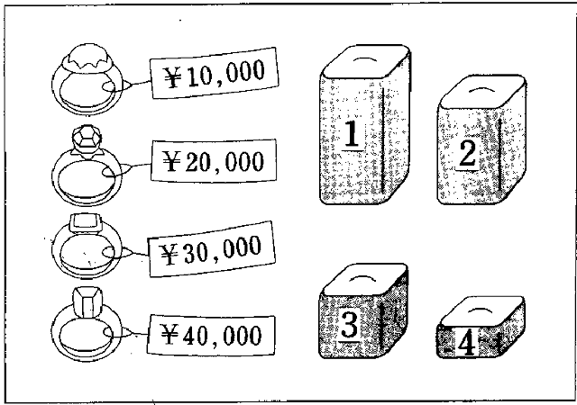 聴解スクリプト: 3番 ここに指輪とそれを置く台があります。1万円の指輪はどの台に置きますか。 女:ええと、始めにこの4万円の指輪ね。これを一番低い台に置いてちょうだい。この台は前のほうに出すから。それから2万円と3万円のは一番高い台と次に高い台の二つにね。あっ、どちらに置いてもいいわ。で、後残ったその台に1万円の指輪を置いてね。 1万円の指輪はどの台に置きますか。