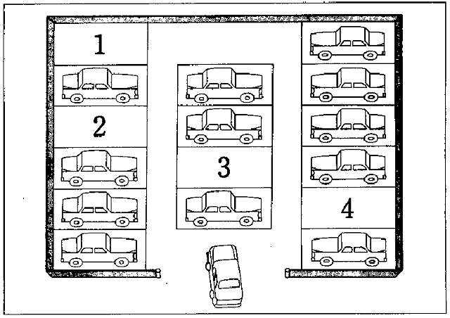 聴解スクリプト: 4番 男の人が車を止める場所を店の人に聞いています。車はどこに止めますか。 男:あの車はどこに止めればいいですか。 女:はい。入って、ええと、左側の手前の三つが当店の専用駐車場になっております。 男:左側の手前の三つですね。 女:はい。で、もしそちらがいっぱいでしたら、真ん中の列をお使いになられてもかまいません。 男:わかりました。どうも。 男の人は駐車場に来ました。車はどこに止めますか。