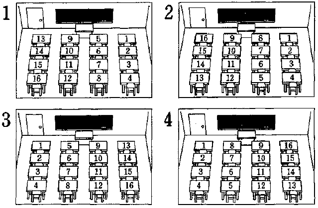 聴解スクリプト: 8番 番号はどのようにつけますか。 男:ええと、じゃ、番号を机につけていってください。黒板に向かって右の列から始めてください。で、前から後ろに番号の若順に1、2、3と並べて、後ろまでいったら、今度は後ろから前にいってください。じゃ、よろしく。 番号はどのようにつけますか。