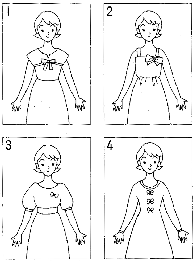 1番 娘が新しく買ったドレスを着て母親に見せています。娘が着ている洋服はどれですか。 女:ね、お母さん、見て。