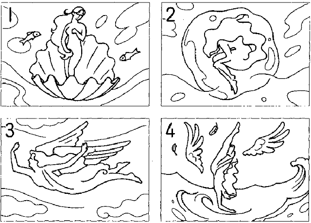12番 女の人が壁の絵を説明しています。この人はどの絵が好きだと言っていますか。 女:ここの沈黙の部屋。この部屋の壁の絵は約200年かかってかかれたそうよ。 男:へえ、すごいね。 女:でしょう。でね、ここから始まって部屋をぐるりと一周する物語になっているのよ。 男:なるほどね。深い海の中の貝から誕生して、泡に包まれて海面に出る。 女