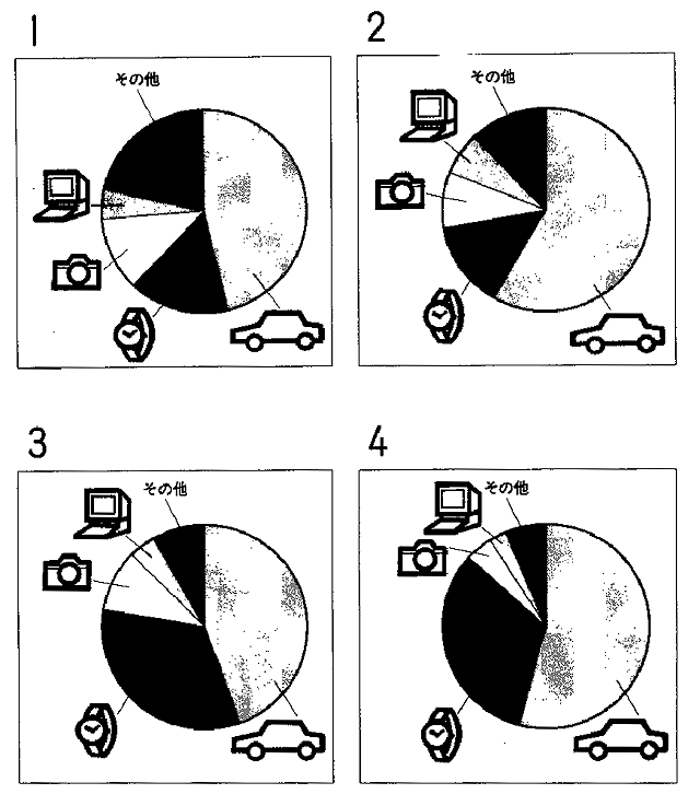 13番 男の人がある工業地帯の工業生産高について説明しています。この工業地帯を現すグラフはどれですか。 男:この工業地帯で最も発達しているのは自動車産業で、これが全体の半分以上の生産高を占めています。次に盛んなのは時計の生産で、これが自動車産業を除く、残りの約三分の一を占め、後はカメラ、コンピューターの順となっています。 この工業地帯を表すグラフはどれですか。