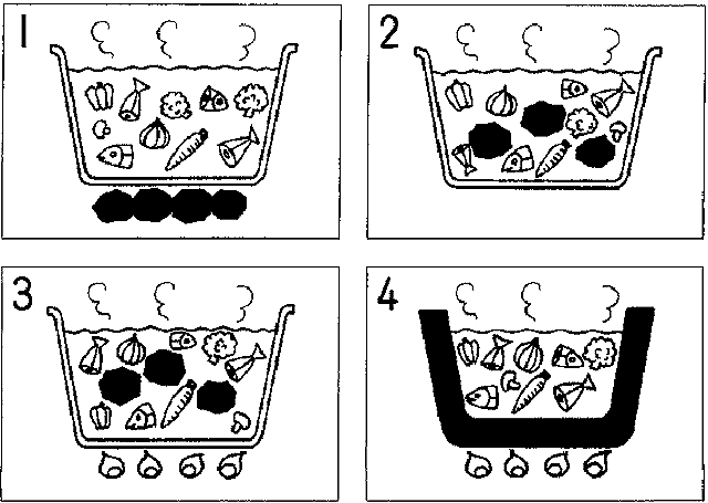 :ああ、それから鍋を火にかけるんですね。 男:いいえ。 女:じゃあ、どうやって煮るんですか。 男:さっきの石ね。