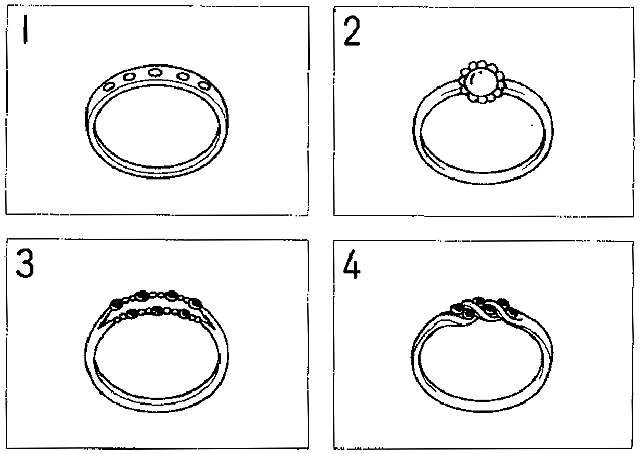 5番 女の人はどの指輪が気に入りましたか。 女:うわあ、あの指輪可愛い。 男:どれ。 女:あの捩じってあるところに石が二つずつ並んでいる指輪。 女の人はどの指輪が気に入りましたか。