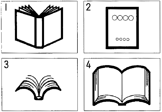 女:じゃあ、この4つの中のどれかですね。 男:うん。本の表紙を正面から見た、これは。 女:本が閉じたままで読んでないみたいですね。こちらの開いたページを上から見たのはどうですか。 男:ちょっと平凡じゃないですか。むしろこっちの本を開いたところを横から見たなんか、変わってて面白いな。 女:でも何だか噴水みたいですね。 男:確かにね。じゃあ、これかな。 女:そうですね。 二人はどのマークを選びましたか。
