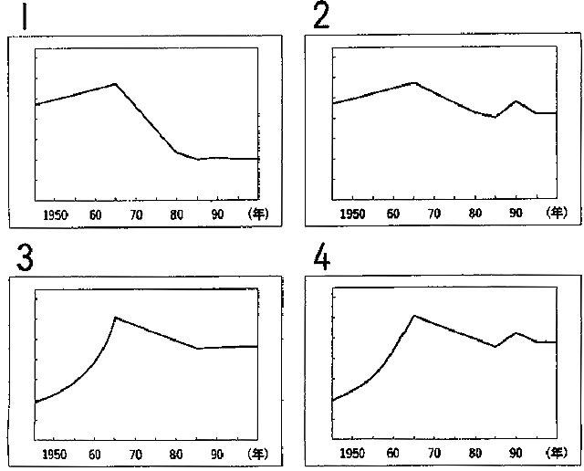 8番 次のグラフはある地域のナイロンの生産の変化を示しています。正しいものはどれですか。 女:1950年代から60年代にかけて、ナイロンの生産は急激に増え続けていますが、1965年を頂点をとして次第に生産が減り、85年以降はあまり変化していません。 正しいものはどれですか。