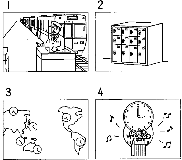 :ねえ、新川駅で人と会う時、何処で待ち合わせしたら良い。 男:そうだなあ。南口の改札かな。 女:でもあそこ人が多いから、駄目。 男:じゃあ、時計の前かな。 女:時計?時計なんて沢山あるじゃない。 男:ほら、音楽が鳴って人形が出てくる、あれ。 女:ああ、からくり時計。 男:そう、そう。 女:あそこなら分かりやすいね。 男:うん。あっ、そうだ。あそこも良いな。 女:何処。 男:西口に沢山時計が壁にかかっているとこあるじゃない。世界のいろんな国の時刻が分かるように。 女:えー?そんなのあったっけ。 男:知らないの?コインロッカーが並んでいるとこのそばだよ。 女