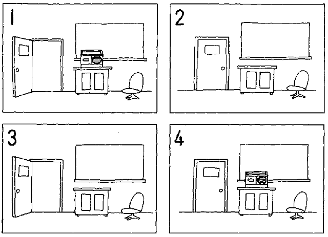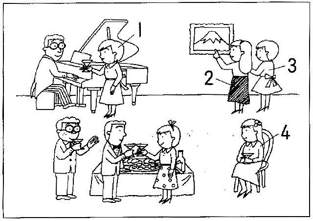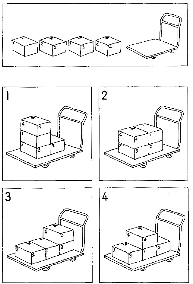 (9) 箱が四つあります。この箱を女の人の言うとおりに置いてください。どのように箱を置き