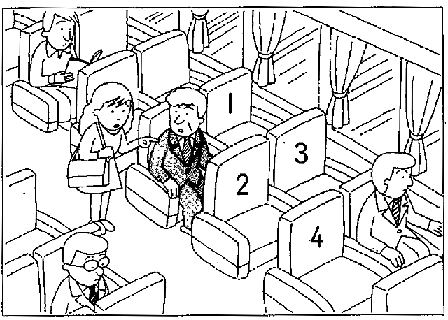 (8) 男の人の席はどれですか。 女:あの、すみませんが、ここ、私の席なんですが。 男: