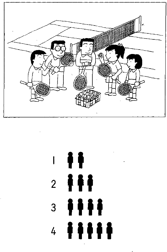 (10) 5人のグループが話をしています。明日は何人でテニスをしますか。 男1:お疲れ様でした。明日も皆