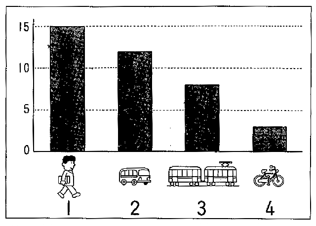みました。見てください。歩きが15人、バスが12人、電車が8人、自転車が5人です。 グラフに間違いがあり