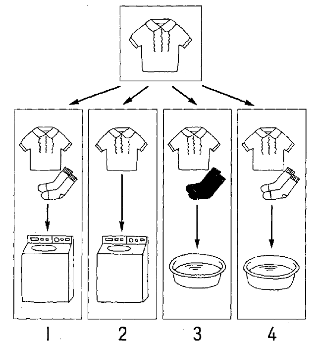 (7) 服の洗い方を説明しています。どれが正しいですか。 女:これはとてもデリケートですから、手で洗って