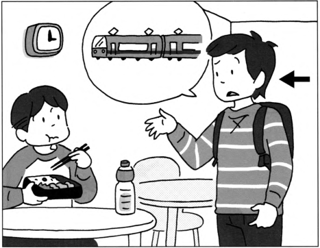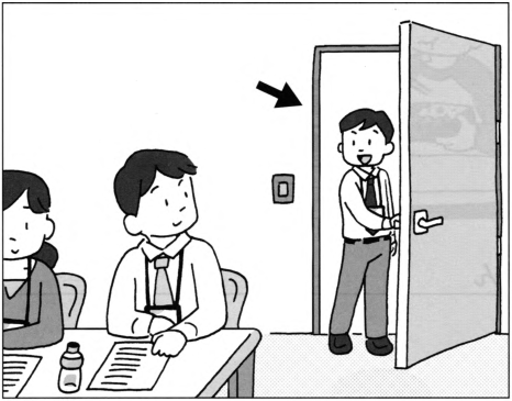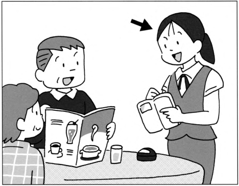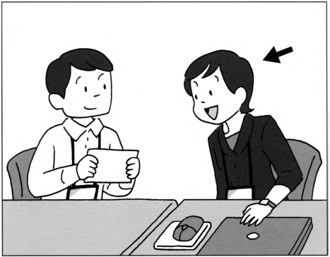 | 聴解•ちょうかい 問題4では、えを見ながら質問を聞いてください。やじるし(->)の人は何と言いますか。1から3の中から、最もよいものを一つえらんでください。 |