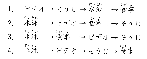 聴解スクリプト: 13ばん (男の人が話しています) 午後はどんな予定ですか? 男:午後の予定を言います、よく聞いてください。 女:はい 男:まず水泳が三時間、そしてビデオを見て、自分の読み方を研究します。終わったら食事です。 女:はい 男:あっ、食事の前に掃除をします 女:えー、掃除をしなければならないですか? 男:はい、じゃー、頑張ってください 女:はーい 午後はどんな予定ですか?