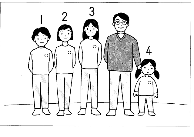 聴解スクリプト: 5ばん (男の人と女の人が写真を見ながら話しています) この男の人の一番上の娘はどの人ですか?一番上の娘です。 男:これ この前家族皆で撮った写真。 女:えー、奥さんいつも若いですね、うえの嬢さんたち二人はお母さんより大きいけど 高校生ですか? 男:いいえ、まだ中学生。上は三年生で、下は一年生。この大きい方が妹なんですよ。もうすぐ僕より高くなりそうでしょう。 女:本当。 この男の人の一番上の娘はどの人ですか?